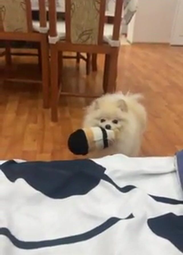 A Pomeranian dog stands in front of a bed holding a sock in its mouth