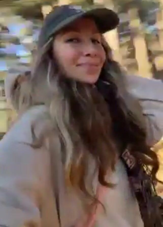A young woman with long, wavy, blondish-brown hair, wearing a baseball cap, a light-colored hoodie, a pink strap across her chest, and a patterned scarf, is moving forward while filming a selfie video