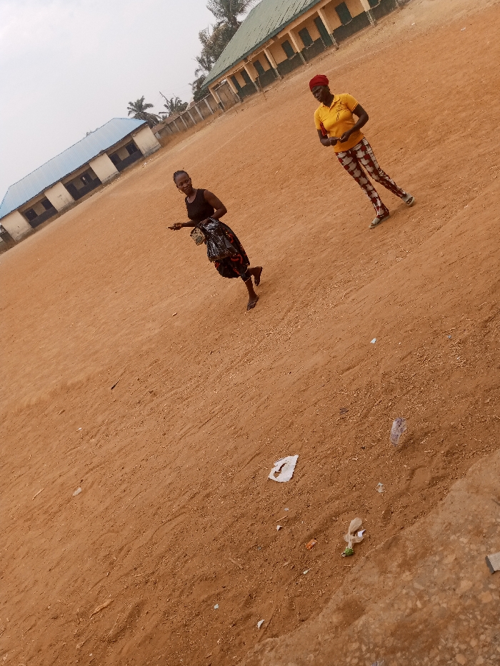 The image depicts an outdoor scene in Akwanga, Nigeria, characterized by a large expanse of reddish-brown dirt ground under an overcast sky