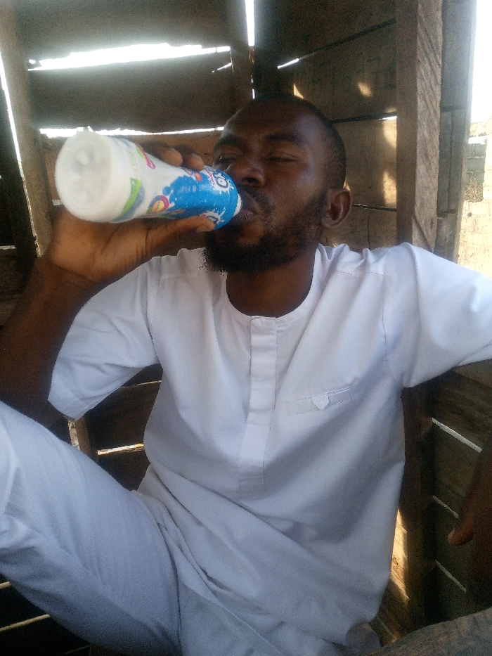 An adult male is seated within a wooden-planked structure in Zango-ndaji, Nigeria. He wears a white short-sleeved tunic with a banded collar and vertical placket, and matching white trousers. The man, with dark skin and a short beard, is actively drinking from a white plastic bottle featuring blue and other colored graphics, held to his mouth with his right hand. His eyes are closed or heavily squinted. The background consists of rough wooden planks, with gaps revealing strong sunlight and a light-colored masonry wall on the right side.