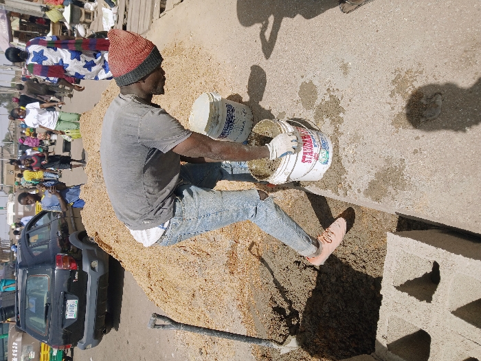 This image depicts an outdoor construction and market scene in Gweru, Zimbabwe. In the foreground, a male subject, dressed in a grey t-shirt, ripped blue jeans, peach-colored athletic shoes, and a red knitted beanie, is bent forward. He wears white gloves on both hands and is actively mixing or scooping a dark, wet aggregate material from a pile into a white plastic bucket labeled "STANDARD." A second, similar white bucket is positioned behind him. To the lower left, two hollow concrete blocks are partially visible. A freshly laid, light grey concrete surface extends horizontally across the mid-foreground. Behind the man, a large, light brown pile of coarse granular material, likely sand or fine gravel, dominates the left-center. A shovel with a dark handle and a silver blade is stuck upright in this pile. In the midground, a black station wagon, specifically a Pontiac Vibe or Toyota Matrix, with roof rails and a rear spoiler, is parked or moving slowly. Its rear license plate begins with "CD 100." The background reveals a bustling, dusty urban street scene with multiple pedestrians walking in various directions. Individuals are dressed in a range of casual attire, including a person in a white t-shirt and light green pants, and another in a blue and white patterned dress or tunic with a patterned scarf. Structures consistent with market stalls or shops are visible along the street, indicating commercial activity. The sky appears clear. Shadows are cast by the subjects and objects, particularly on the concrete surface in the foreground.