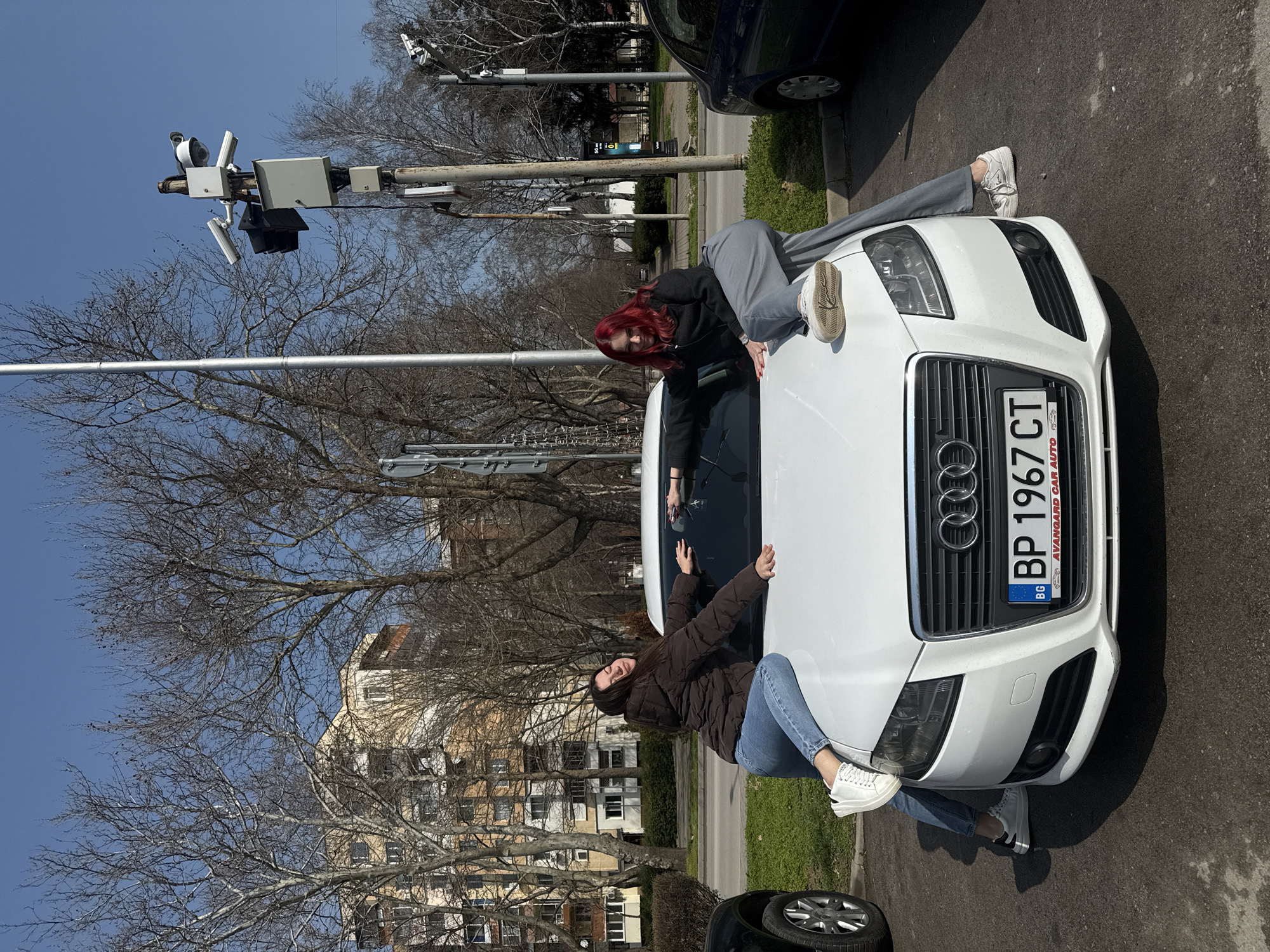 - "The scene depicts two young adult females posing on the hood and windshield of a white Audi A3 sedan (Bulgarian license plate BP 1967 CT) in an outdoor urban setting in Kozloduy, Bulgaria" by FM-cSrrR2, licensed under CC BY 4.0