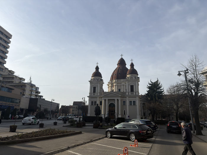 The image displays a wide-angle view of the Ascension of the Lord Orthodox Cathedral in Târgu Mureș, Romania, situated at a major urban intersection