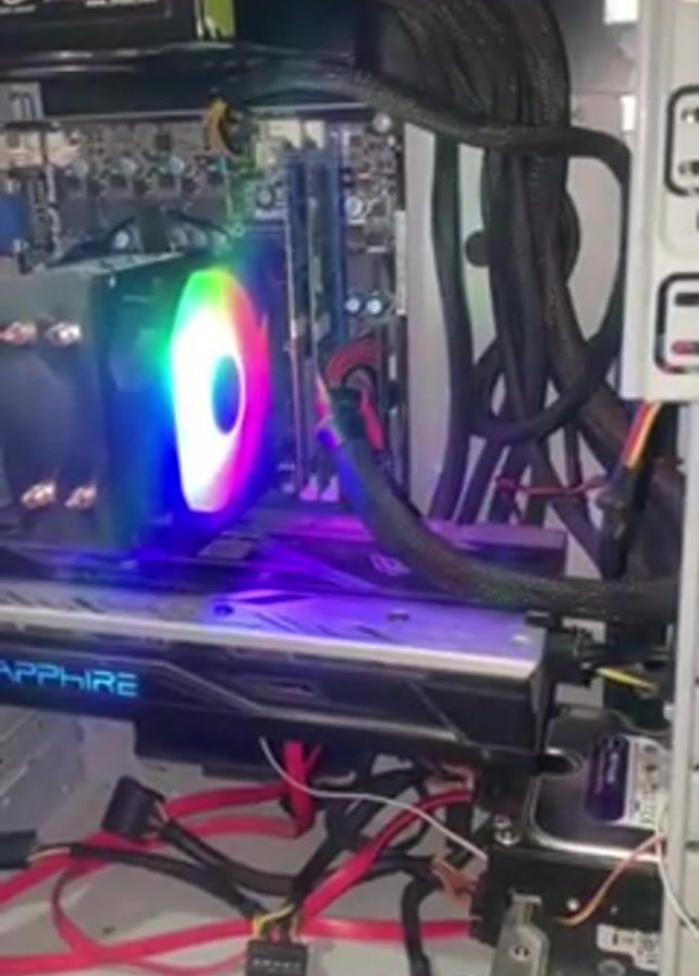 The inside of a desktop computer case is shown. A rainbow-colored CPU cooler sits atop the motherboard. Below it, a Sapphire-branded graphics card spans the width of the case. Various red and black power cables snake through the interior, connecting components. A hard drive is mounted on the right side of the case. The overall arrangement appears functional, if a bit cluttered with cables.