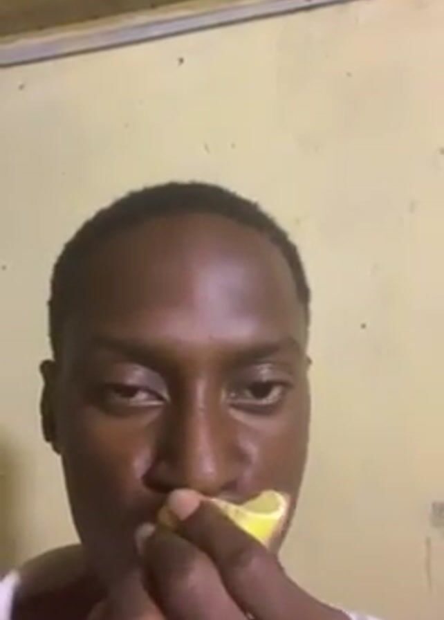 A person is holding and chewing on a wedge of lemon. The person is directly facing the camera with neutral expression. The background shows a light yellow wall and a wooden plank ceiling.