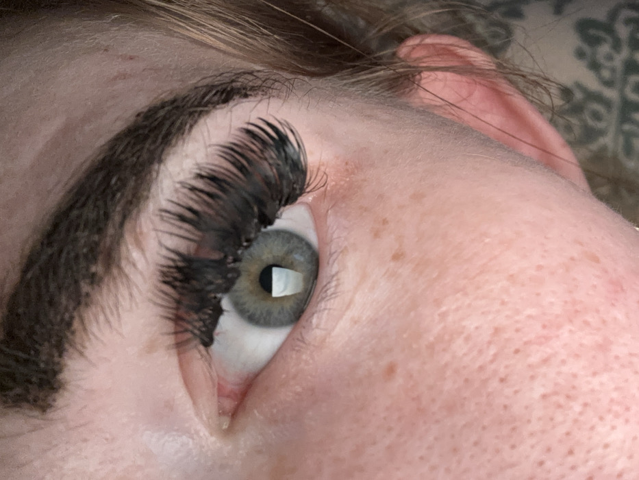 A close-up, high-resolution forensic image depicts a human left eye and surrounding facial features. The eye exhibits a greenish-grey iris and a dark, dilated pupil. A distinct, elongated, white rectangular reflection of a light source is visible within the pupil, extending slightly into the lower iris, accompanied by a smaller reflection superior to it. The upper eyelid is adorned with dense, long, and dark eyelashes, indicative of cosmetic enhancement or mascara. Above the eye, a segment of a dark, thick eyebrow is visible. The skin is fair-toned, displaying visible pores and scattered small, brown freckles across the cheek and temple areas. Fine, light brown hair strands are present along the right side of the image, partially obscuring the upper helix of a human ear, which is also partly visible. The background immediately behind the ear shows a soft-focus, abstract textile pattern. The precise location in the city of Burgas, Bulgaria, cannot be determined from the visual information provided in the image.