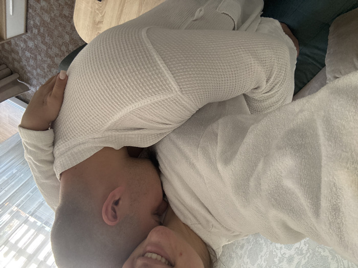 The image depicts two individuals, an adult female and an adult male, in an indoor room in Velingrad, Bulgaria. The female, partially visible on the left, wears a white terrycloth bathrobe and exhibits a partial smile. Her left arm is positioned around the male. The male, positioned centrally, wears a white waffle-weave bathrobe and has his head resting against the female's chest/shoulder area. His right arm is wrapped around the female's back. The background features light-colored patterned wallpaper on the left, a window with a sheer curtain on the right, and a patterned carpet on the floor. A light wooden surface is visible in the lower right, and a teal-colored cushion is present in the lower left. Natural light illuminates the scene from the right.