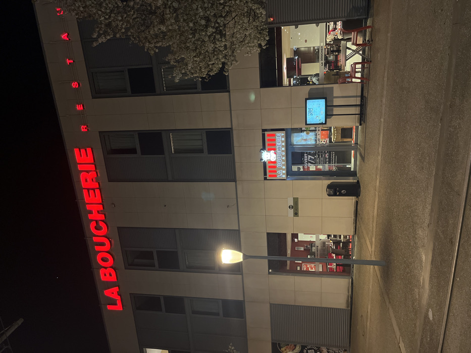 restaurant called "La Boucherie" at night. It is located at 49.216, 3.996, Bezannes, France. The restaurant is lit up with a large red sign on the facade. The sign reads "LA BOUCHERIE RESTAURANT." The restaurant has a glass storefront with a large "OUVERT 7/7" sign. There is a trash can in front of the entrance. Two red chairs are visible outside the restaurant. A streetlamp stands in front of the restaurant. There are tables and chairs visible through the window. Several people are dining inside, with a man standing near the front entrance. A tree with white blossoms stands to the right of the restaurant. The building appears to be a multi-story structure with multiple windows on each floor. The facade is off-white. The environment is a quiet street at night.