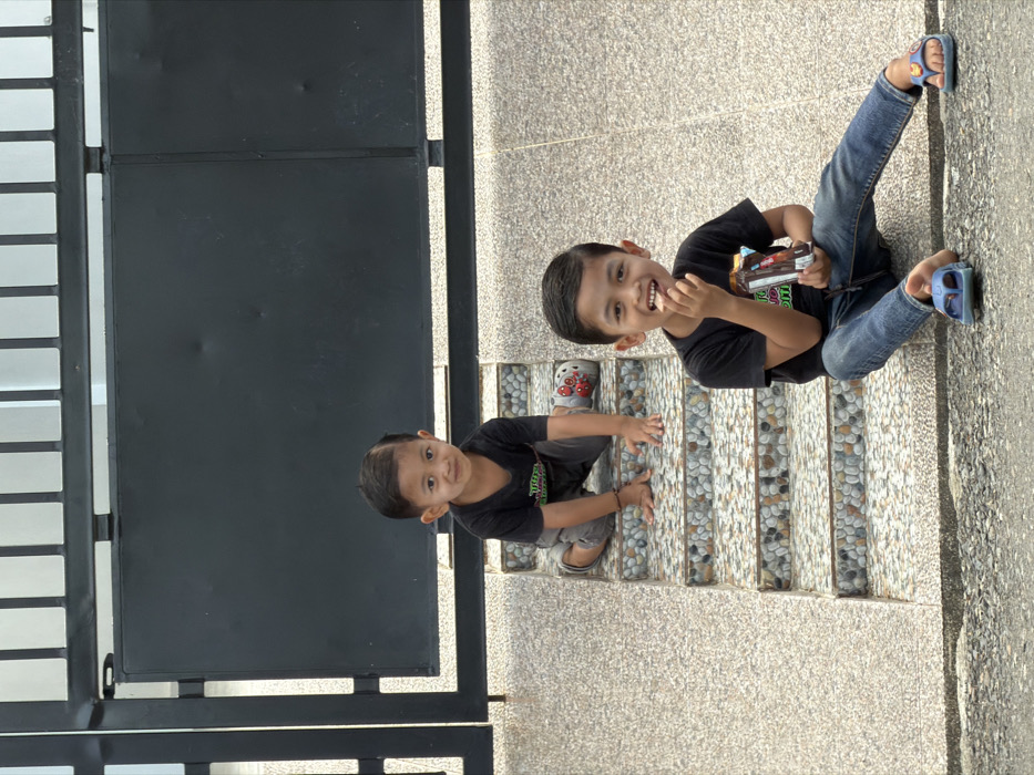 The image depicts two young male children outdoors in Lhokseumawe, Indonesia. In the foreground, a child wearing a black t-shirt, blue jeans, and blue flip-flop sandals (one removed from his left foot) sits on a dark grey asphalt or concrete surface. He holds a partially open snack packet in his left hand and brings a piece of food to his mouth with his right hand, looking towards the camera with a smile. Behind him and to the left, a second child, dressed in a black t-shirt and grey shorts, kneels on the second step of a three-step staircase. This child also smiles towards the camera. A red and white Hello Kitty-branded slipper is visible on the step near his left foot. The staircase steps are surfaced with small, multi-colored pebble-like tiles, while the adjacent ground and risers are light grey speckled concrete. Behind the children is a dark grey metal gate, composed of solid panels and vertical bars, with a lighter-colored wall visible beyond it.