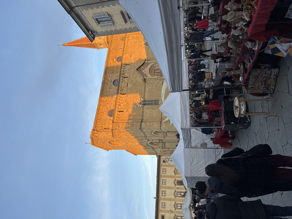 A bustling outdoor market is in full swing with vendors displaying their wares beneath white canopies. People browse the items, including antiques, ornaments, and artwork. The backdrop features a tall, golden-hued building with a pointed spire, likely a cathedral. The sky above is a clear blue, suggesting a sunny day. A building with windows on multiple floors is on the right edge of the image.
