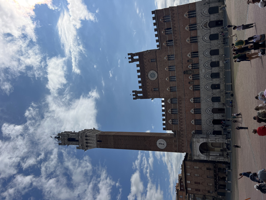 The image depicts the Piazza del Campo in Siena, Italy, under a partly cloudy blue sky