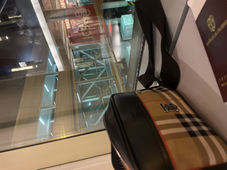 An angled view through a window reveals an airport terminal or similar structure with walkways and supports. Outside the window, there is a reflection of shops. Inside, a black and tan plaid bag with a dark shoulder strap and a burgundy passport with a crest on it are visible. The overall composition suggests someone waiting at an airport.