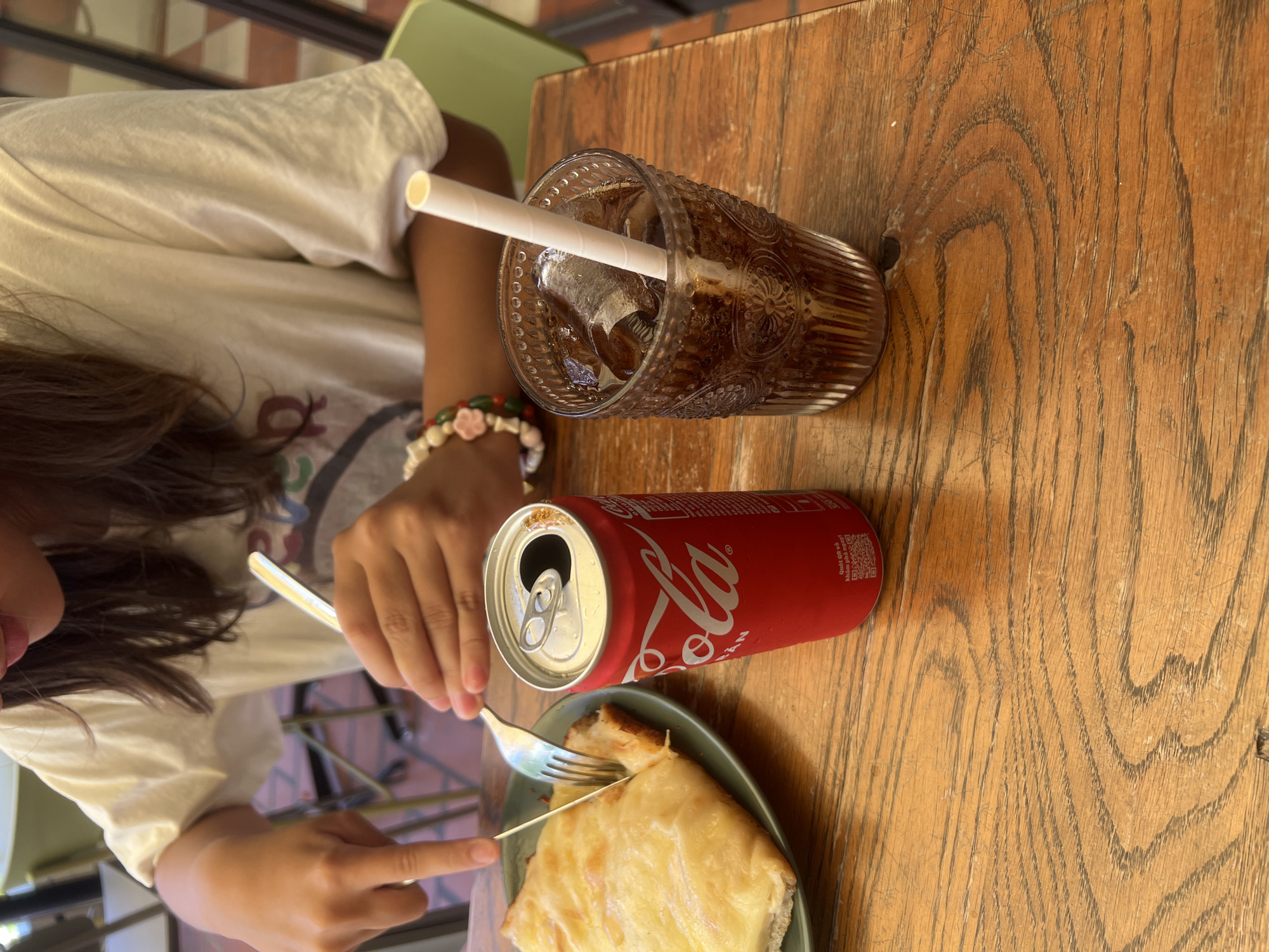 The scene captures a moment at an outdoor cafe in Nha Trang, Vietnam. A person is seated at a wooden table, visible from the chest up. The individual wears a white t-shirt and a bracelet with floral beads is seen on one wrist. They use a fork and knife to cut into a piece of toast topped with cheese on a green plate. Next to the plate is an open can of Coca-Cola. Further up the table is a glass filled with a dark liquid and ice, accompanied by a white paper straw. The cafe's flooring features alternating light and dark tiles in a checkerboard pattern. The wooden table reveals a distinct wood grain pattern and surface texture. The general location appears to be a casual dining setting, likely in a tourist-frequented area of Nha Trang.