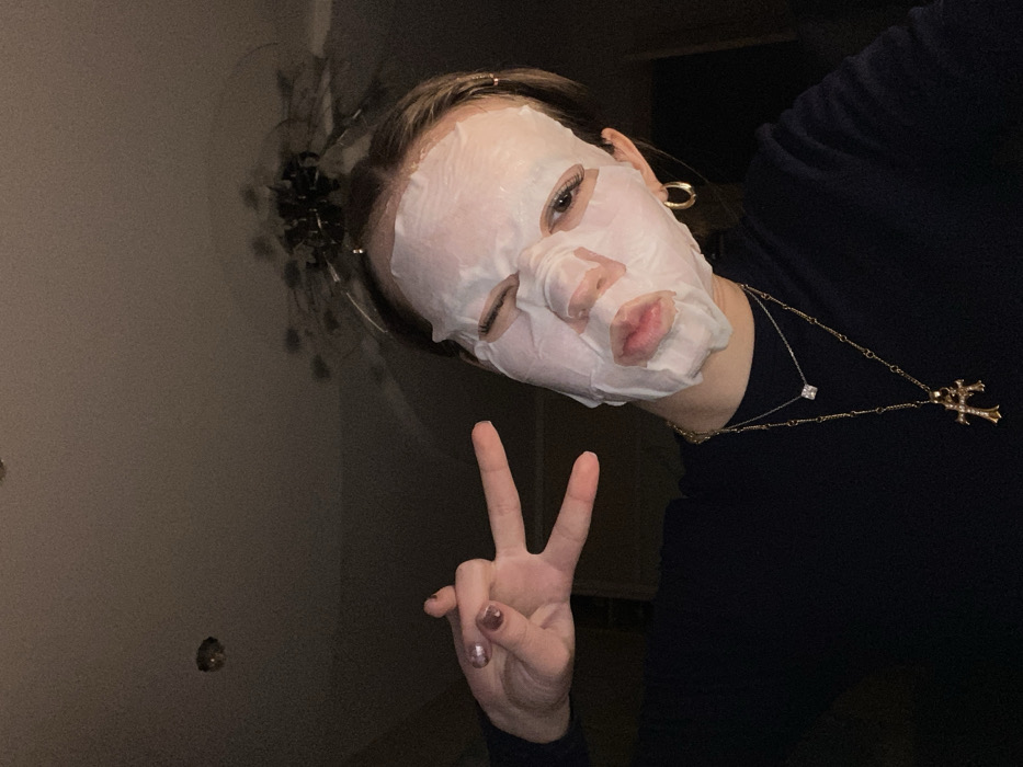 A close-up photograph depicts an individual indoors, identified as being in the city of Chaikovsky, Russia. The subject is wearing a white sheet face mask, which covers the majority of the face, leaving the eyes and lips exposed through cutouts. The individual's left eye (viewer's right) is winking, while the right eye is open. The lips are pursed forward. The subject's left hand (viewer's right) is raised, with the index and middle fingers extended to form a "V" sign; the fingernails are painted with a dark, shimmery polish. The individual is wearing a dark long-sleeved garment. Visible accessories include a gold-colored hoop earring in the right earlobe (viewer's left), a shorter silver-colored necklace with a square pendant, and a longer gold-colored necklace featuring an ornate gold cross pendant. The background is dimly lit and out of focus, revealing a light-colored ceiling with a dark, possibly decorative, ceiling fixture in the upper right quadrant and a small, dark circular object (possibly a detector or light) in the upper left.