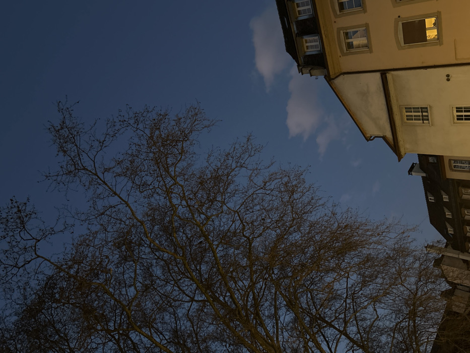 The image depicts an urban street scene in Strasbourg, France, viewed upwards during dusk or early night. The sky, occupying the upper right quadrant, is a deep indigo blue with a few scattered, illuminated white clouds. The left and upper-left sections are dominated by the intricate, leafless branches of a large deciduous tree, silhouetted against the sky and subtly illuminated from below. Architectural elements include a multi-story building on the far right with a light beige facade, featuring multiple rectangular windows with white frames. The top story includes two dormer windows beneath a dark, sloped roof. A single window on a lower floor exhibits warm interior illumination. To the left of this building, another multi-story structure with a lighter, possibly off-white, facade and similar white-framed windows is visible, also topped by a dark, pitched roof. Further left and partially obscured, additional historic buildings with dark, steeply angled roofs, numerous small dormer windows, and several chimneys extend into the background. No individuals or active movement are present.