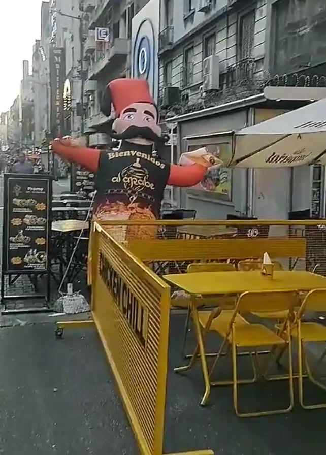 The camera focuses on a street scene featuring an inflated advertising figure standing outside a restaurant. The figure, with a cartoonish face and a red hat, wears a vest that reads "Bienvenidos al arabe". It has its arms outstretched. Behind the figure, yellow metal barriers with "CHICKEN CHILL" written on them separate the outdoor dining area from the street. Tables and chairs are visible within the dining area. To the left of the figure, a menu board displays food items. The street is lined with buildings, and a few pedestrians are visible. The weather appears overcast.