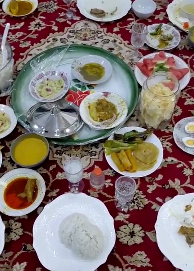 A static, medium shot shows a dining table covered with a red patterned tablecloth. Numerous white plates and bowls are scattered across the table. Many dishes are partially eaten, including rice, chicken, vegetables, and watermelon. There are also small glasses filled with water or other beverages. A couple of trays are placed on the table. The scene implies a meal has taken place.