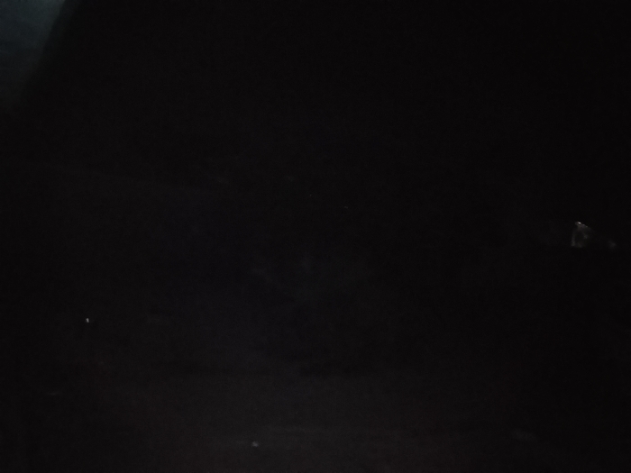 The image is almost entirely black, with minimal discernible features due to the low light conditions. There are slight variations in darkness, suggesting subtle textures or shapes within the scene. A few faint, indistinct objects appear on the right edge of the image. Overall, the image lacks detail and is dominated by darkness.