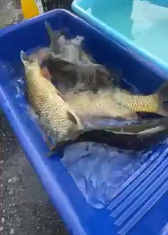 The scene features a person's hands partially visible, gently stirring several fish in a blue plastic tray filled with water