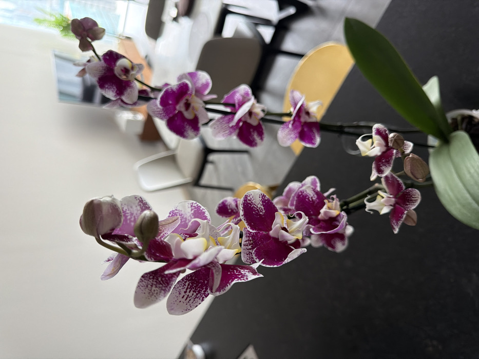 A close-up captures a blooming orchid with delicate white and purple speckled petals. The flower stem extends from the lower to the upper frame, showcasing open blossoms and buds. Lush green leaves emerge from the right. The background includes blurred elements: office chairs, a table, and two-tone black and white surfaces.