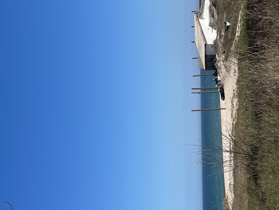 An outdoor scene captured in Lozenets, Bulgaria, depicts a tranquil coastal environment under a clear, bright blue sky. The top two-thirds of the image are dominated by the unobstructed sky. Below the horizon, a calm body of water, likely the Black Sea, extends across the mid-ground, exhibiting deep blue and green hues. A sandy beach, light in color, separates the sea from a vegetated dune area. On this sandy expanse, to the right of the frame, stands a modest, single-story white building with a light-colored, possibly tiled, gabled roof. A small satellite dish is affixed to the roof's peak. To the left of this building and on the sand are five dark wooden posts, oriented vertically and spaced apart, with at least one thin line or rope connecting some of them horizontally. Adjacent to these posts and the building, on the sand, are several miscellaneous items, including dark cylindrical objects (possibly tires) and lighter-colored, folded materials (potentially fabrics or tarps). The immediate foreground is characterized by dry, yellowish-green grasses and sparse, leafless woody vegetation, consistent with dune flora. No individuals are discernible in the frame. The overall impression is one of a quiet beach setting during daylight hours under fair weather conditions.