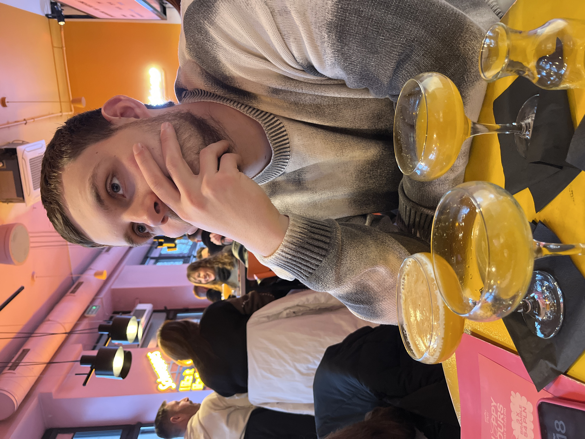 A man with short dark hair and a beard, wearing a gray and white striped sweater, is sitting at a table in a restaurant. He is looking at the camera with his hand on his face. There are two glasses of orange liquid on the table in front of him, along with napkins and a pink card with text. Other people are visible at the table and in the background. The interior of the restaurant has a pink and yellow color scheme with black pendant lights. The writing on the card indicates "Happy Hours" and "Bramble 54 PLN." The card contains the text, "Krakow, Poland."