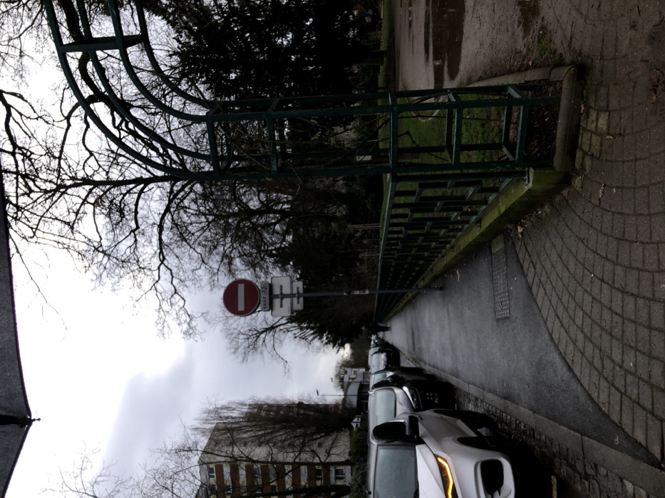 The image depicts a street scene in Schiltigheim, France, under an overcast sky, observed from beneath a dark umbrella. In the foreground, a dark green metal arbor structure stands on the right, marking an entrance to a park or green space. Adjacent to it, a matching dark green metal fence runs parallel to a wet asphalt sidewalk, separated by a low moss-covered concrete curb. The ground beneath the arbor and next to the fence is dark earth with visible puddles, transitioning to a patterned brick path before becoming asphalt. On the left, a row of vehicles is parked along the sidewalk. The closest vehicle is a white SUV with its daytime running lights illuminated, facing away from the camera. Several dark-colored cars are parked behind it. The asphalt sidewalk, visibly wet, extends into the distance. A tall metal pole supports two signs: a prominent red circular "No Entry" sign ("Sens Interdit") at the top, with a white rectangular sign below it stating "SAUF" (except) and displaying a bicycle symbol, indicating an exception for cyclists. Further down the sidewalk, a lone person, dressed in dark clothing, walks away from the camera. The background on the left features a multi-story residential building with exposed concrete and numerous windows, surrounded by tall, bare deciduous trees. The right side of the background shows a dense cluster of mostly bare trees within a park setting, some appearing evergreen. The overall lighting is dim and diffused, consistent with an overcast day.