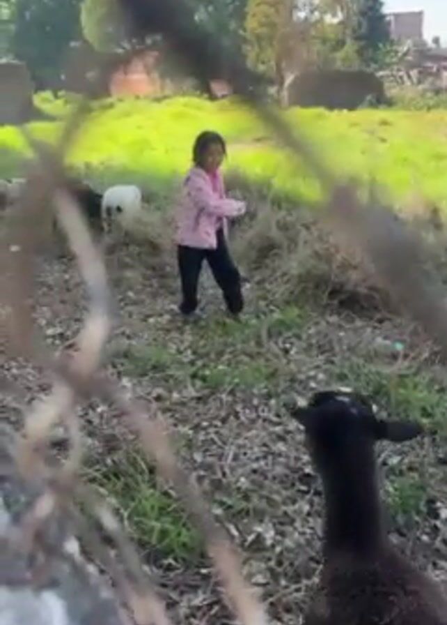 A young girl in a pink jacket and dark pants stands in a grassy field with several sheep, including one that is primarily black. The girl is gesturing and moving around, seemingly interacting with the sheep. The sheep are grazing and moving around the field as well. The scene is viewed through a chain-link fence. The background consists of green grass, trees, and a couple of buildings in the distance. The lighting is bright, suggesting it is daytime.