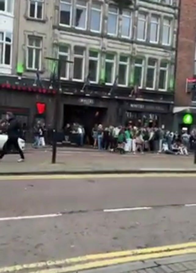crowd of people, many wearing green, gathered outside a bar called "White's Tavern" on a city street