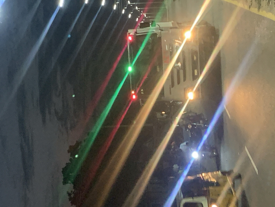 The image depicts a nighttime street scene in Adankolo, Nigeria. A white heavy-duty truck, possibly a refuse vehicle, dominates the center, facing the viewer with two amber headlights, two red flashing lights, and a central green light mounted on its roof. To the left of the truck, several motorcycles are present, one with a prominent white headlight. A yellow three-wheeled vehicle (keke Napep) is partially visible on the far left. Multiple individuals are clustered near the motorcycles and the tricycle. The road is paved with white lane markings visible. The background shows a dark, cloudy sky with trees silhouetted on the left and numerous streetlights extending into the distance. Bright light sources from vehicles and streetlights create significant lens flare effects across the frame, manifesting as diagonal streaks of red, green, amber, and blue light.