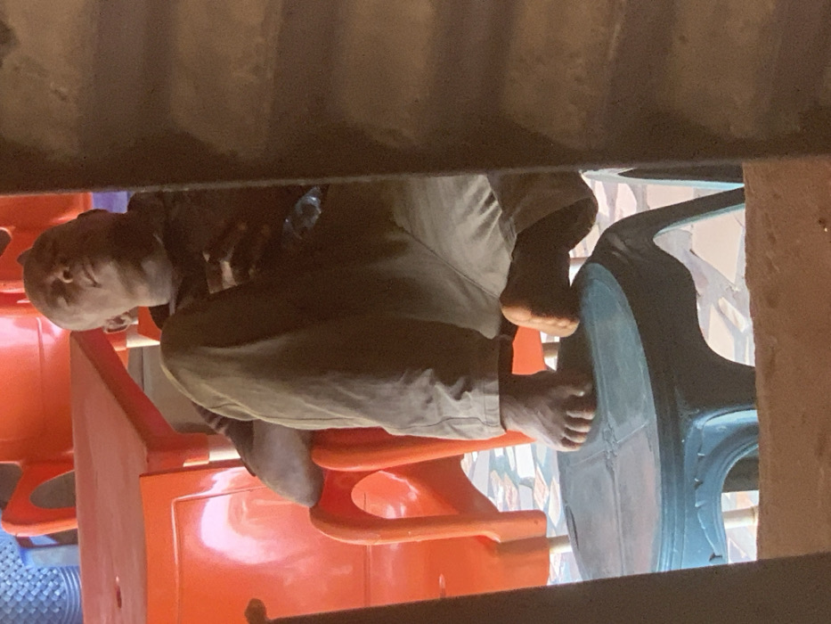 The image depicts an adult male in Onitsha, Nigeria, seated and appearing to rest or sleep, with his eyes closed. He has a shaved head, wears a dark top and light trousers. His bare feet are propped on a light-blue plastic stool. A small, transparent plastic bottle is observed near his right hand. The background features several out-of-focus bright orange plastic chairs and tables, suggesting a public or semi-public outdoor seating area. The ground surface is paved with light-colored tiles. The scene is partially obscured on the right by a dark, vertical structure.