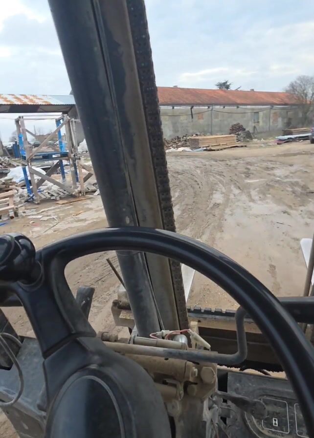 The camera, positioned within the cab of a forklift, captures a view of a muddy industrial yard