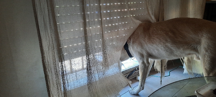 The image displays an interior residential setting in Holon, Israel. A light-colored dog, likely fawn or tan, is positioned in the center-right of the frame, facing a window. Its hindquarters and mid-section are visible, and it wears a dark-colored collar. The dog stands amidst a set of light-colored, possibly off-white or beige, sheer curtains or vertical blinds which exhibit extensive damage, including prominent tears and shredded fabric, particularly in the lower-middle and mid-sections where the dog is positioned. Behind the damaged curtains, a window with horizontal slatted blinds is discernible, allowing bright external light to enter; an exterior rolling shutter is visible through the slats. The floor is paved with light-colored square tiles. A light blue cable lies on the tiled floor near the dog's front legs. A segment of a round glass-topped table is present in the lower right foreground, with a white container partially visible beneath it.