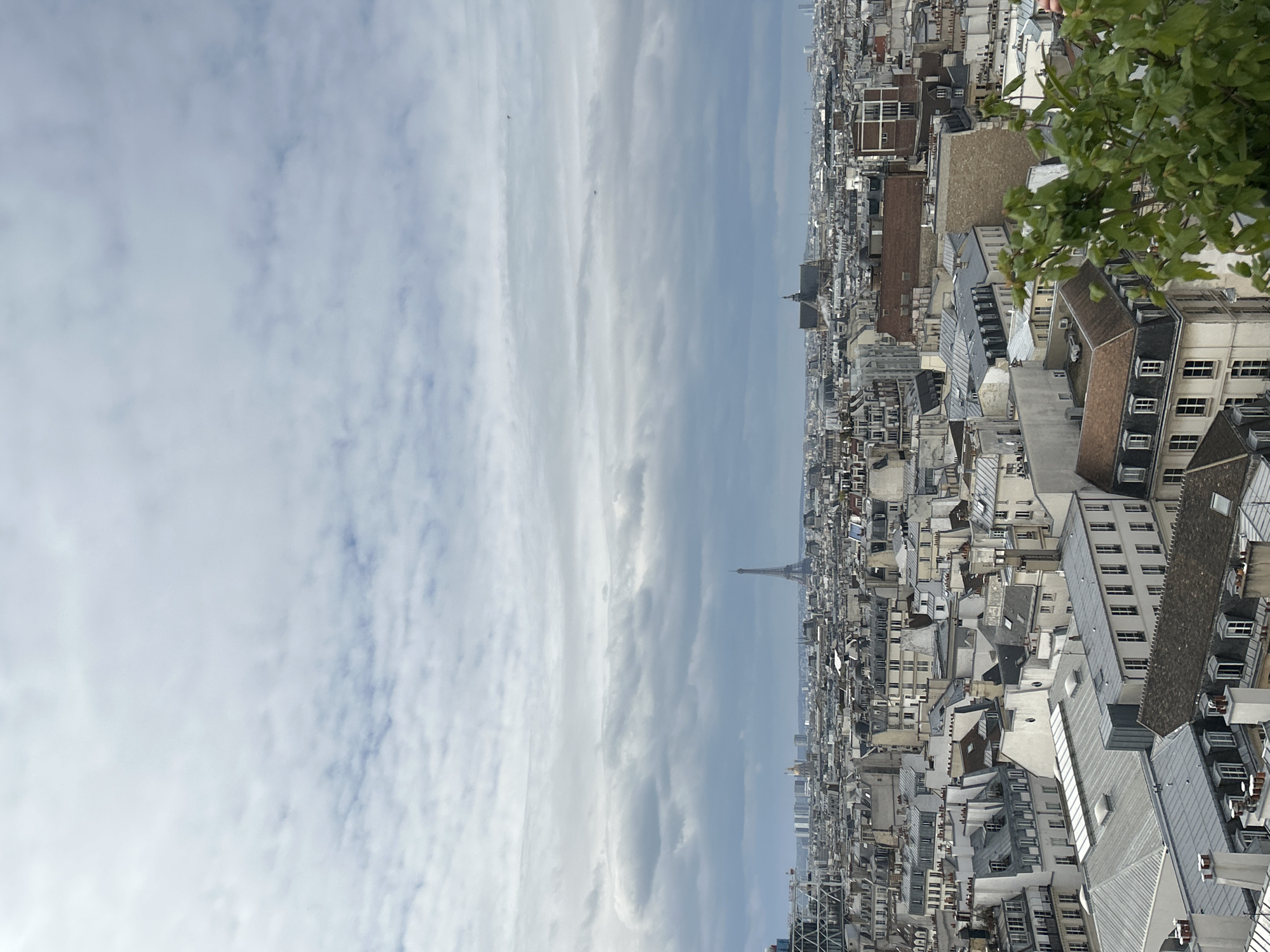 The image presents a panoramic aerial view of the Parisian cityscape, captured from an elevated vantage point under an overcast sky. The scene is dominated by a dense urban fabric composed primarily of classic Haussmannian buildings, characterized by their light-colored stone facades, multi-story structures, and distinctive grey zinc or slate roofs. These rooftops are replete with dormer windows and numerous chimneys. In the mid-distance, slightly to the left of the frame's center, the Eiffel Tower stands prominently as a key landmark, its dark silhouette visible against the cloudy background. To the far left, a modern building with a complex, geometric facade and a red construction crane rises above the traditional rooftops. Further in the distant background, to the left of the Eiffel Tower, a cluster of modern high-rise towers (characteristic of the La Défense business district) is faintly visible on the horizon. To the right of the Eiffel Tower, another significant building with a large, dark, intricate roof and a central spire-like element is discernible amidst the urban sprawl. The immediate foreground in the lower right corner features green foliage from a tree or shrub, partially obscuring the nearest rooftops. The sky occupies the upper half of the image, displaying extensive grey cloud cover with varying densities. No individuals or explicit human actions are visible within the frame. The lighting is diffused and uniform, consistent with an overcast day. The location is Paris, France, observed from an elevated position within the city's central arrondissements, providing a westward or southwestward view towards the Eiffel Tower and the distant La Défense skyscrapers.