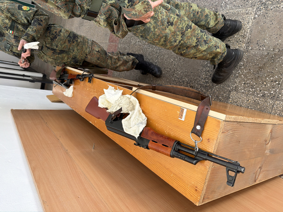 The scene is an indoor environment, likely a facility or training room. A precise location within the city of Sofia, Bulgaria, cannot be determined from the visual evidence, though personnel are identified as Bulgarian military by uniform insignia. The environment features a plain white wall serving as a backdrop to a light-colored wooden cabinet or workbench. A single metal nail is partially driven into the wooden surface on the left. The floor is covered with grey, mottled square tiles. A darkened area, possibly a doorway or corridor, is visible in the background to the right. Two individuals are present, wearing military camouflage fatigues with green, brown, and black patterns, and black tactical boots. The individual on the left wears a Bulgarian flag patch on their right sleeve and a military emblem on their left sleeve. This person is shown from the upper torso down, holding a small metallic object and a piece of crumpled white cloth, engaged in what appears to be firearm maintenance. The second individual, partially visible on the right, is shown from the lower torso down, standing upright. Two Kalashnikov-pattern rifles are positioned horizontally on the wooden surface. The rifle in the foreground features a dark reddish-brown wooden stock and handguard, with black metallic components. A crumpled piece of white cloth rests on its receiver. A brown leather sling, equipped with a metal ring and snap button, is attached to the rifle's front sling swivel and extends off the front edge of the wooden surface. A second, similarly constructed Kalashnikov-pattern rifle with wooden furniture is partially visible further to the right on the same surface, also with a piece of crumpled white cloth on its receiver.