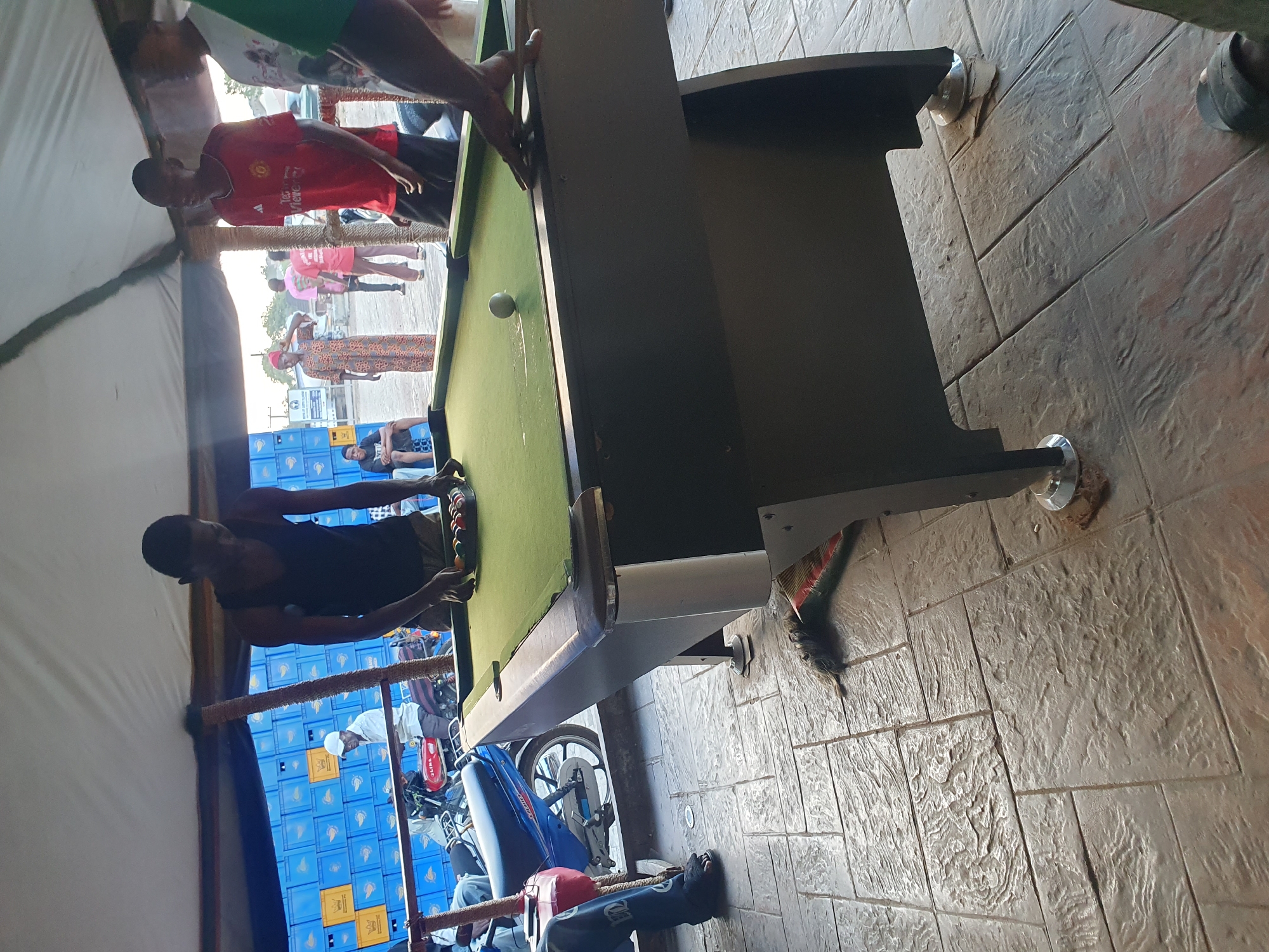 The scene depicts an outdoor recreational area under a white tent-like canopy during daylight hours. In the foreground, a young adult male in a black tank top and dark shorts leans over a green-felted pool table, actively arranging multi-colored billiard balls into a black triangular rack. A white cue ball rests on the table. The hands of another individual are visible on the right side of the table, positioned near the table's edge. Several people are present in the immediate vicinity and background. Directly opposite the racking individual, a male in a red Manchester United jersey stands observing the table. In the mid-ground, a man wearing a white shirt and a white cap is seated on a red motorcycle, labeled "J.LINK," parked in front of a tall stack of blue beverage crates. These crates feature yellow crown logos, consistent with Star beer branding. Further back, a woman in a long, patterned dress stands facing right, and another male is seated on a low black stool. Additional figures are visible in the distant background, including individuals on what appears to be a street or open area. A blue motorcycle is partially visible parked to the left of the pool table. The ground is paved with textured grey rectangular tiles. A broom with red and green bristles lies on the tiled floor near the base of the dark grey pool table, which is supported by legs with chrome levelers. The environment is consistent with a casual, semi-open-air establishment in an urban setting, such as those found in Lokoja, Nigeria.