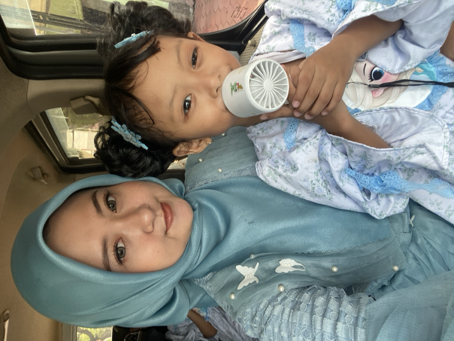 An image taken inside a vehicle in the city of Sumorame, Indonesia, depicts an adult female and a young female child. The adult female, positioned on the left, wears a light blue hijab and a matching long-sleeved garment embellished with white pearl-like beads and two white butterfly appliques on the left chest area. She faces the camera with a slight smile. The child, situated to her right, appears to be 5-8 years old with dark hair styled in two pigtails, each secured with a blue butterfly hair clip. She wears a white dress featuring a light blue floral pattern, blue lace trim, and a graphic of the character "Elsa" on her chest. The child holds a small, white cylindrical portable fan to her lower face with both hands. The vehicle's interior includes a beige headliner, and a blurred individual in light blue is partially visible in the far-left background. The external environment visible through the vehicle windows is indistinct but suggests an outdoor setting during daylight.