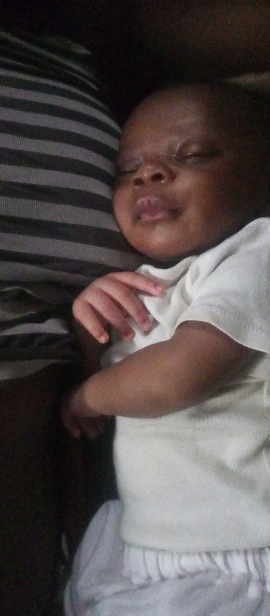 An overhead shot depicts an infant of African descent, approximately aged 0-6 months, sleeping in a low-light indoor setting within the city of Unknown, Unknown. The infant is positioned with its head towards the upper right and its body extending towards the lower left. Its eyes are closed, and its mouth is slightly parted. The infant is wearing a light-colored (likely white) short-sleeved top and a light-colored (likely white) bottom garment with an elasticized waist. The infant's left hand is visible, resting near its midsection. The infant is lying on a surface covered with a textile featuring horizontal stripes in dark grey and light grey. The background to the top and right of the infant is dark and indistinct.
