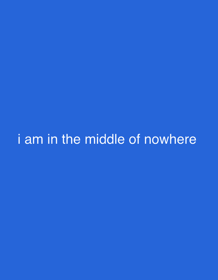 The image displays a uniform, saturated blue background. White sans-serif text is centrally positioned in the lower-middle section, stating: "i am in the middle of nowhere". No individuals, physical objects, or environmental features are present within the frame. The scene offers no visual representation of the city of Jiayuguan, China, or any specific geographic location; it is a purely graphic composition devoid of depicted actions or interactions.