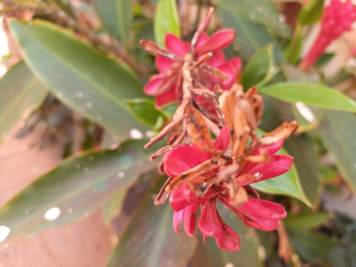 A close-up, high-angle photograph captured in Oturkpo, Nigeria, features a flowering plant. The central focus is on two clusters of deep pink or reddish flowers, each exhibiting significant portions of dried, brown, and brittle botanical material at their core, indicative of post-bloom senescence or developing seed structures. Individual petals appear slightly wilted or worn. Surrounding and partially obscuring the flowers are multiple large, ovate green leaves, some displaying small, irregular white or light-colored spots. The background and foreground are softly blurred, indicating a shallow depth of field, under what appears to be natural daylight conditions. No human subjects, animals, or artificial structures are discernible.