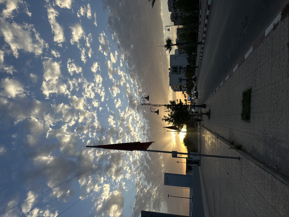 This image depicts an urban street scene in Sebaa Rouadi, Morocco, at either sunrise or sunset. The sky features numerous scattered white altocumulus clouds against a blue background, with the sun low on the horizon to the left, casting prominent crepuscular rays. A dark red flag, resembling the Moroccan flag, hangs vertically from a pole on the left sidewalk. This sidewalk, paved with grey and tan tiles, runs parallel to a two-lane asphalt road. To the left, a modern building with a partial "AUDI" logo is visible. Along the right side, a similar tiled sidewalk contains a small, square patch of grass. Multiple ornate black streetlights with double lamp heads and small trees are spaced along the pavement. One individual is visible walking on this right-side sidewalk, partially obscured by a tree, moving away from the sun's direction. The asphalt road features a concrete median strip with red and white painted curbs. Several vehicles, including cars and SUVs, are present on the road in the distance, generally traveling away from the viewer. Multi-story, light-colored buildings and palm trees line the street in the background. The lighting suggests late afternoon or early morning, with long shadows extending from objects towards the right.