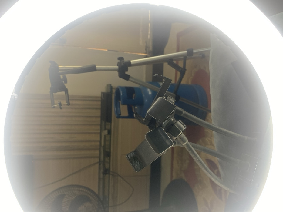 The image displays an indoor scene viewed from within the illuminated aperture of a ring light