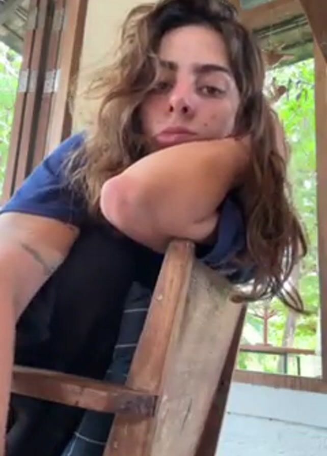 A young woman sits on a simple wooden chair indoors, leaning an elbow on the chair back with her head resting on her hand. She gazes directly at the camera. Her long, wavy brown hair is slightly disheveled. She wears a blue t-shirt and dark pants. The fingers of her outstretched hand show some smeared dark markings. Behind her, a window reveals a lush green exterior. The interior walls are off-white and appear slightly worn. Another wooden window frame is to the left. The image is well-lit, with a neutral, unadorned background. The sound of running water is audible.