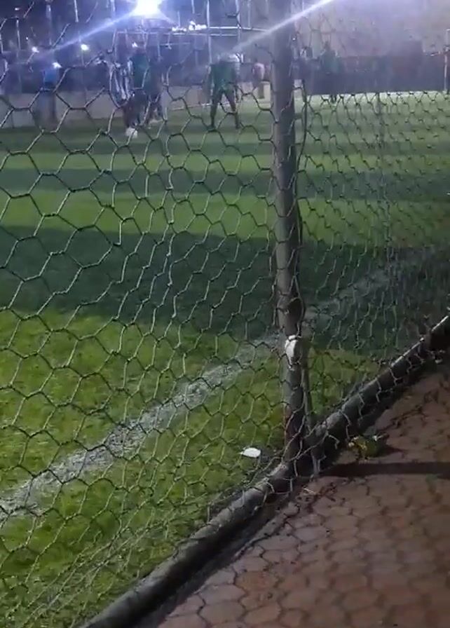 The video depicts an outdoor soccer game at night, viewed through a chain-link fence