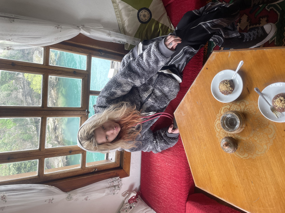 This image depicts an indoor scene, likely a cafe or restaurant, situated along the Neretva River in Mostar, Bosnia and Herzegovina. A large, rustic wooden-framed window, comprising multiple panes, dominates the background, revealing vibrant turquoise river water and green foliage on the opposing bank under an overcast sky. A single individual is prominently featured, seated on a red upholstered bench that lines the interior wall. This person, with long wavy blonde hair partially tinted reddish-pink and a septum piercing, is wearing a grey marled fleece hoodie, dark patterned pants, and black Converse-style sneakers. The individual is leaning back against the bench, looking directly at the camera, and holding a small black electronic device in their right hand. White sheer curtains with embroidered floral patterns are tied back on either side of the window. A white pillow with red floral designs and an olive-green pillow with a dark circular pattern are visible on the bench. In the foreground, an octagonal wooden table with a faint golden mandala-like design is present. On the table are two small white plates, each holding a spherical brown dessert item topped with crushed nuts and a small fork or spoon. Additionally, a small, ornate bronze or copper lidded pot and a clear glass containing ash are positioned on the table surface.