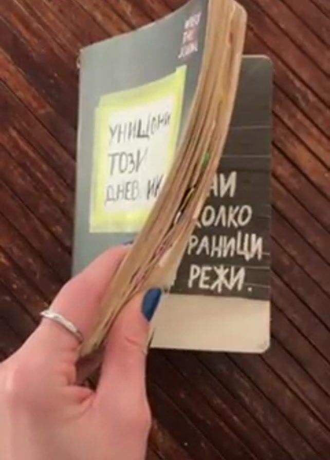 A person with blue fingernails and a silver ring on their left hand is holding a book. The book is open and they are leafing through the pages. The title of the book is "Wreck This Journal" and beneath that, in another language, is the title "Унищожи този дневник". The book has many items stuck between the pages, and the pages appear aged and filled with various marks and doodles. The book is being held over a wooden surface with a ribbed texture.