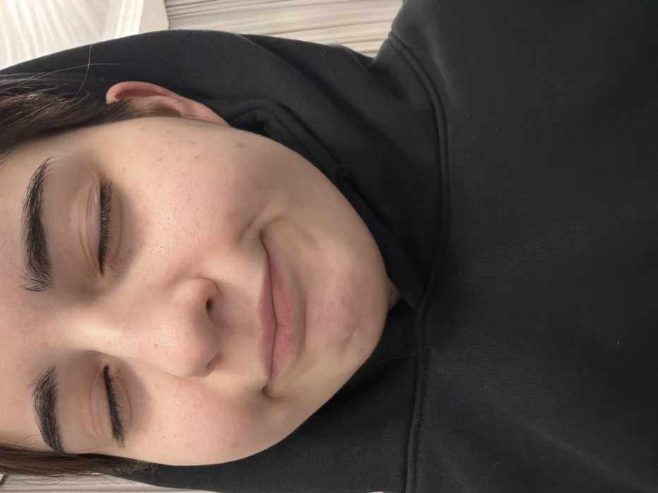A person with closed eyes and arched eyebrows is seen from the nose up. The skin is fair with visible pores. Their lips are slightly parted in a relaxed expression. They are wearing a black hoodie, with the hood pulled up around their head. The image is slightly angled, creating a diagonal composition.