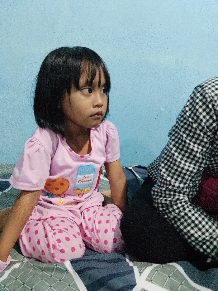 A young girl, approximately 5-8 years old, is seated on a multi-colored patterned bedspread, possibly a quilt or sheet, against a plain light blue wall. She has straight, dark hair with bangs and is wearing a light pink short-sleeved top featuring a graphic of an 'Ice Cream' cone and a cookie, paired with matching pink pants adorned with dark pink polka dots. Her head is turned slightly to her right, and her eyes are directed off-frame in that direction. To the right of the girl, the upper torso and right arm of an adult wearing a black and white plaid long-sleeved shirt are partially visible. The scene is an indoor setting within a residence in Kecamatan Pati, Indonesia.