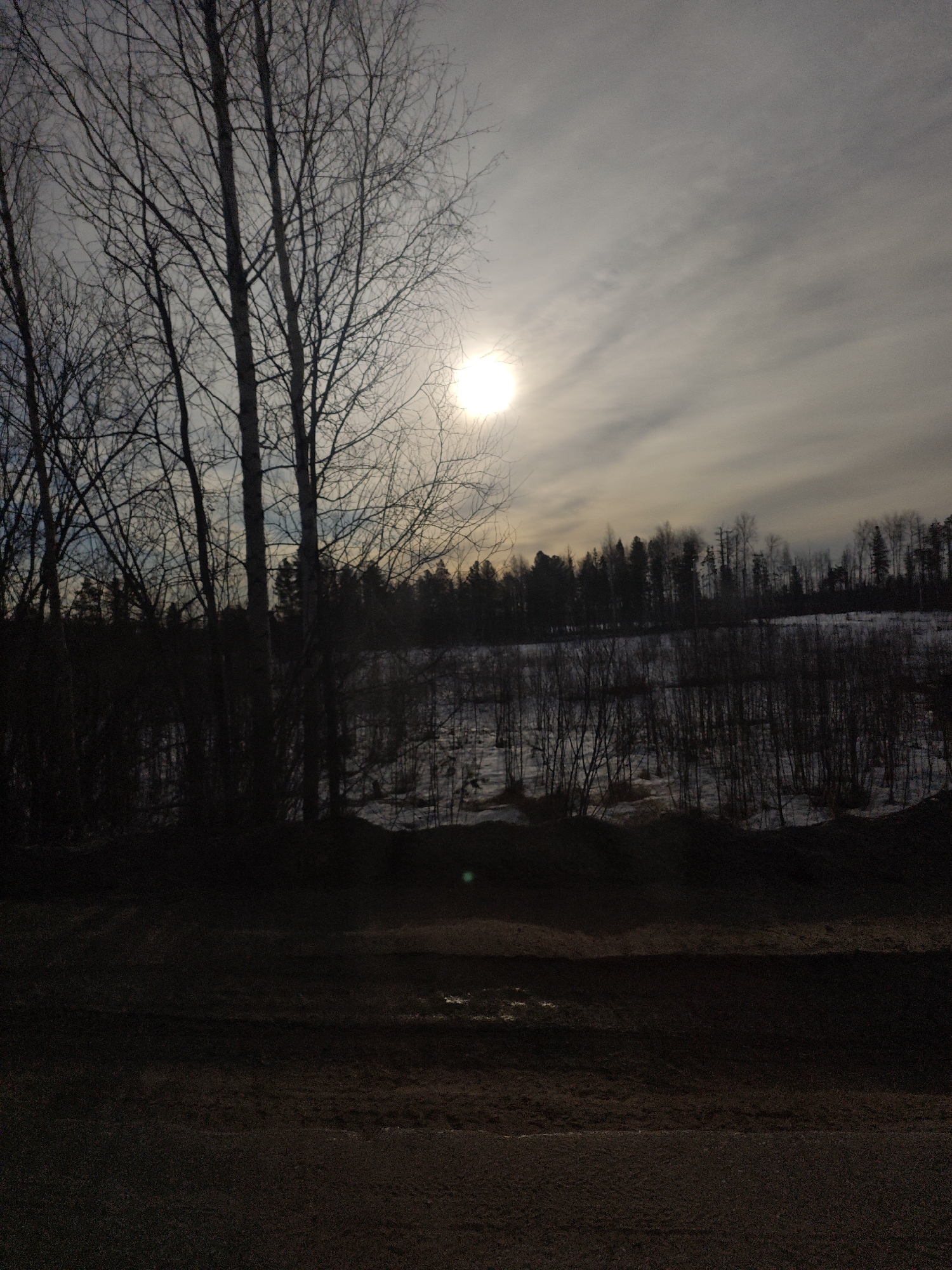 A landscape photograph taken in Unknown, Russia depicts a winter scene. Bare deciduous trees stand silhouetted in the foreground. Behind them, a snow-covered field stretches towards a dark line of coniferous trees on the horizon. The sun is visible through thin clouds, positioned high in the sky. The foreground shows a patch of dark earth or gravel.