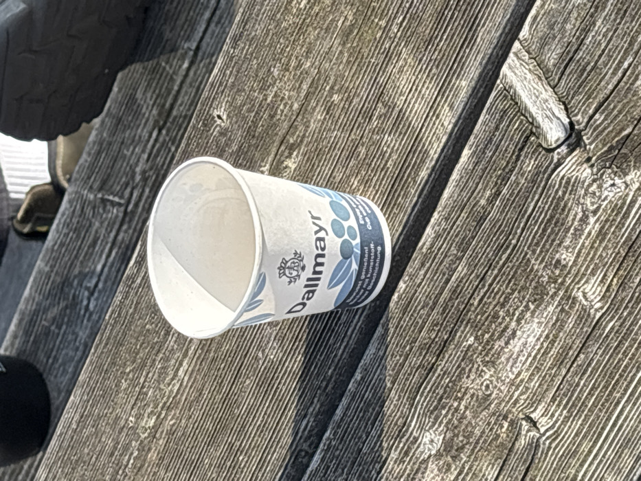 - "A white paper cup, bearing the "Dallmayr" brand logo in blue text, a crest, and a band of stylized blue coffee beans/olives, rests on a weathered wooden surface" by FM-hSlL72, licensed under CC BY 4.0
